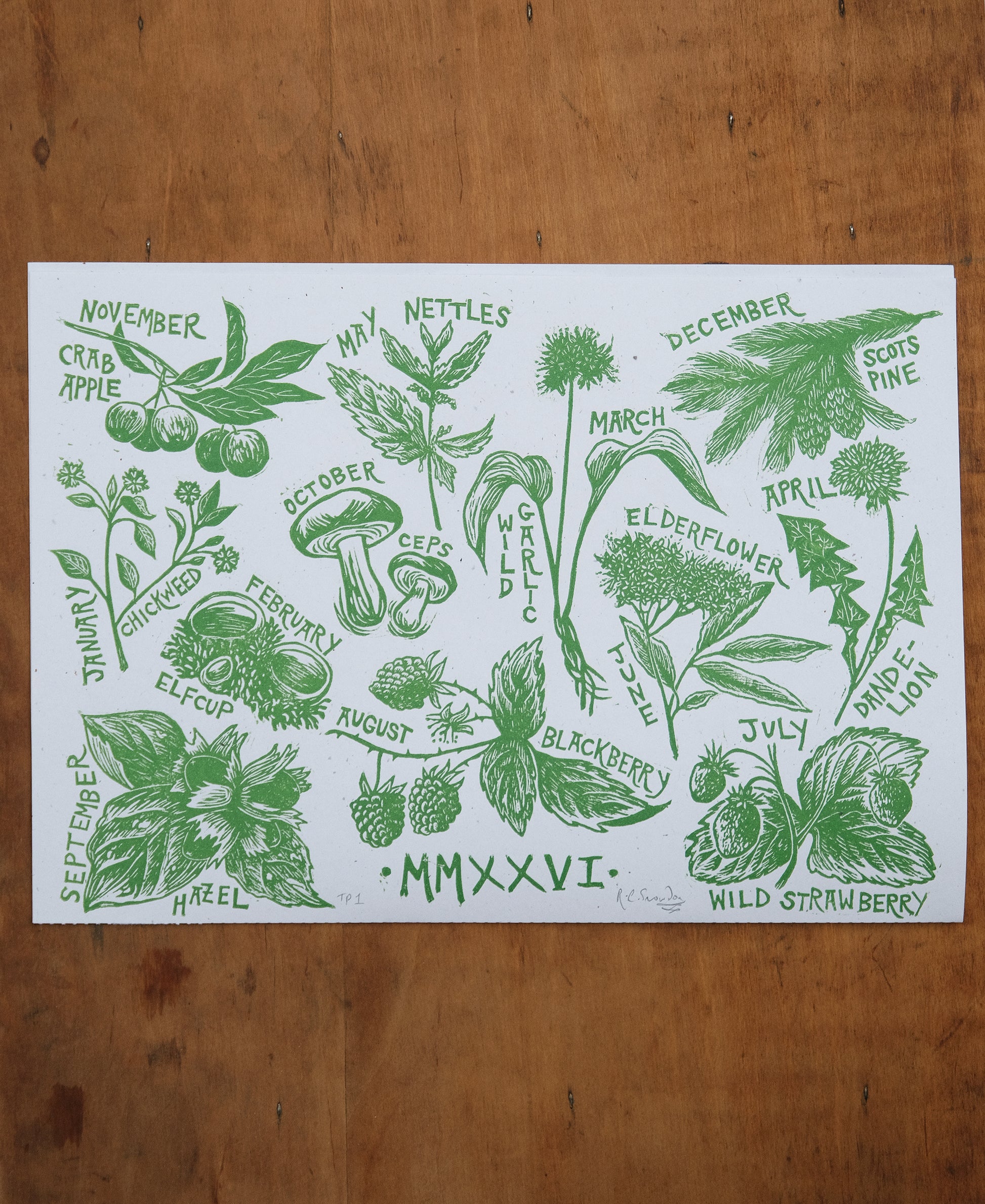 The Foraging Year - 2026 A3 Linocut Calendar and Poster - Limited Edition