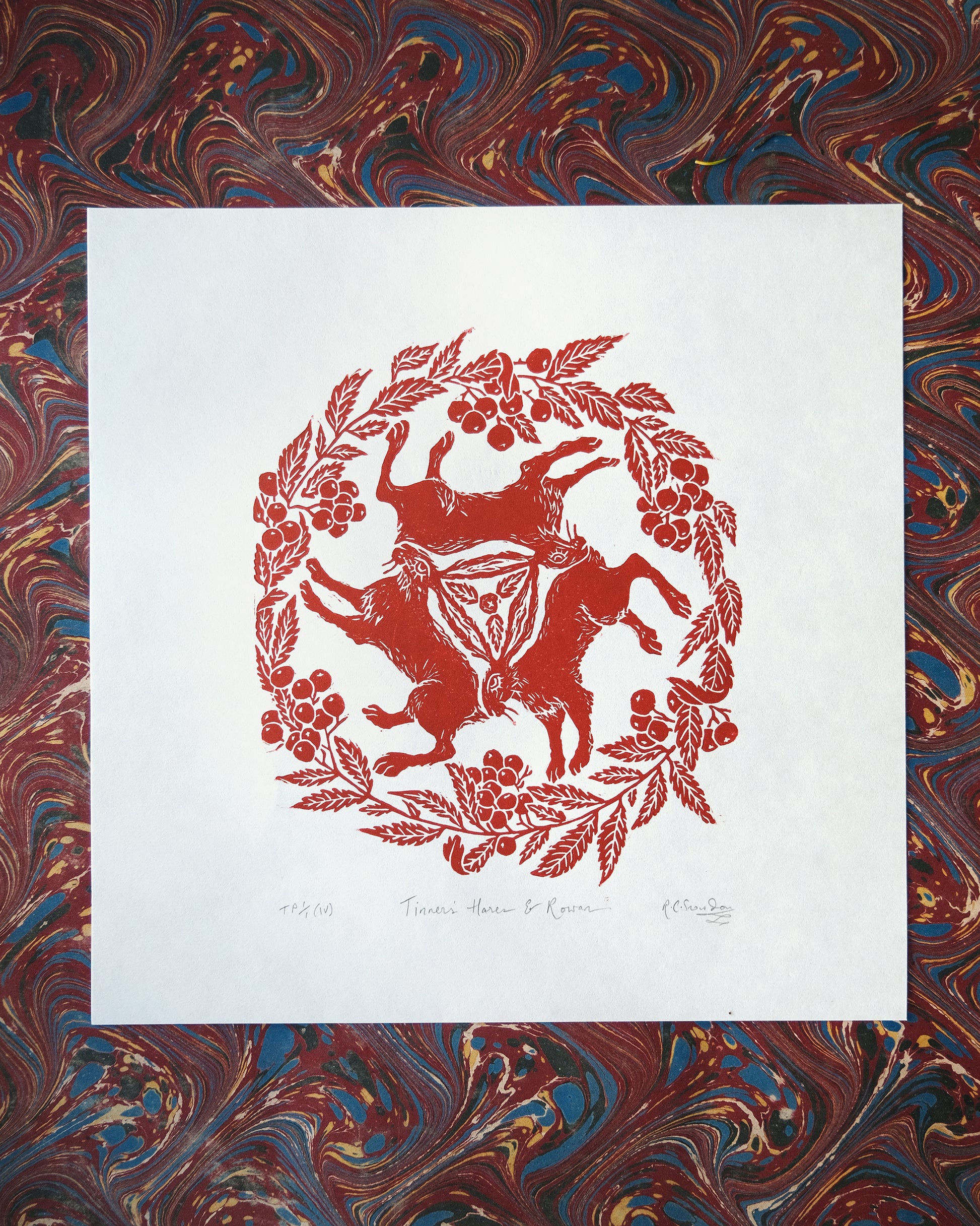 'Tinners' Hares and Rowan' is based on the magical three hares motif, which has existed in various forms since the 7th century. It has been depicted in China, The Middle East, Europe, and, most uniquely, as an architectural feature to many Devon churches not far from where I live - and from where my inspiration was originally piqued. There’s also a claim that the local Devon tin-miners —who helped repair and fund the churches— also adopted the three hares symbol as a sign of their patronage, thus, the Tinners’ Hares!